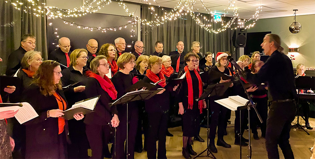 Een welkomstwoordje en dan klinkt onder leiding van Ludwig Attevelt het eerste lied ‘Do you hear what I hear’. We hebben de weken voorafgaand geoefend maar hoewel de voorbereiding aan de korte kant is geweest zingen we voldoende goed, gezien het applaus. Dat geeft alvast een goed gevoel voor de rest. Want vervolgens zingen we nog een aantal mooie kerstnummers waarna de beurt aan Karen Vogel is en die ons laat genieten van een prachtig nummer op de piano. Hierna wordt het kerstverhaal ‘De kolenkit-ruiter’ voorgedragen door Jan. Een verhaal ter overdenking voor de kerstperiode.